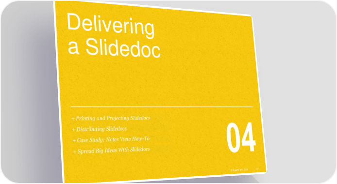Delivering a Slidedoc +Printing and Projecting Slidedocs +Distributing Slidedocs +Case Study: Notes View How-To +Spread Big Ideas With Slidedocs 04 ©© DDuuaarrttee,, IInncc.. 22001144 137137 Slidedocs Page 41 Page 43Go to section