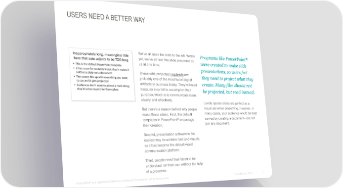 USERS NEED A BETTER WAY We’ve all seen the slide to the left. Worse Programs like PowerPoint® yet, we’ve all had this slide presented to were created to make slide us at one time. presentations, so users feel These odd, projected misdeeds are they need to project what they probably one of the most hated digital create. Many files should not artifacts in business today. They’re hated because they fail to accomplish their be projected, but read instead. purpose, which is to communicate ideas clearly and effectively. Lovely sparse slides are perfect as a visual aid when presenting. However, in But there’s a reason behind why people make these slides. First, the default many cases, your audience would be best templates in PowerPoint® encourage served by creating a document—but not their creation. just any document. Second, presentation software is the easiest way to combine text and visuals, so it has become the default visual communication platform. Third, people need their ideas to be understood on their own without the help of a presenter. ® PowerPoint is a registered trademark of Microsoft Corporation. All rights reserved. © Duarte, Inc. 2014 5