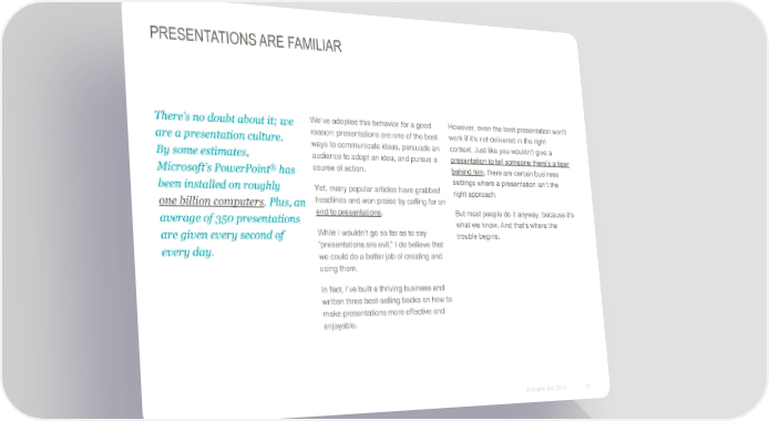 PRESENTATIONS ARE FAMILIAR We’ve adopted this behavior for a good However, even the best presentation won’t There’s no doubt about it; we reason: presentations are one of the best work if it’s not delivered in the right are a presentation culture. ways to communicate ideas, persuade an context. Just like you wouldn’t give a By some estimates, audience to adopt an idea, and pursue a presentation to tell someone there’s a tiger ® course of action. behind him, there are certain business Microsoft’s PowerPoint has been installed on roughly settings where a presentation isn’t the Yet, many popular articles have grabbed right approach. one billion computers. Plus, an headlines and won praise by calling for an average of 350 presentations end to presentations. But most people do it anyway, because it’s what we know. And that’s where the are given every second of While I wouldn’t go so far as to say trouble begins. every day. “presentations are evil,” I do believe that we could do a better job of creating and using them. In fact, I’ve built a thriving business and written three best-selling books on how to make presentations more effective and enjoyable. © Duarte, Inc. 2014 11