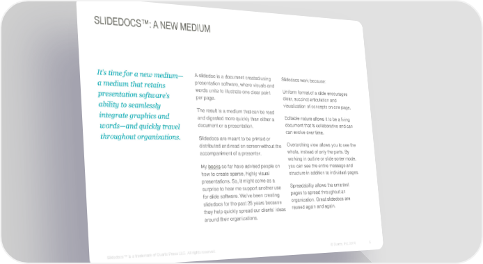SLIDEDOCS™: A NEW MEDIUM It’s time for a new medium— A slidedoc is a document created using Slidedocs work because: a medium that retains presentation software, where visuals and words unite to illustrate one clear point Uniform format of a slide encourages presentation software’s per page. clear, succinct articulation and ability to seamlessly visualization of concepts on one page. The result is a medium that can be read integrate graphics and and digested more quickly than either a Editable nature allows it to be a living words—and quickly travel document or a presentation. document that is collaborative and can can evolve over time. throughout organizations. Slidedocs are meant to be printed or distributed and read on screen without the Overarching view allows you to see the accompaniment of a presenter. whole, instead of only the parts. By working in outline or slide sorter mode, My books so far have advised people on you can see the entire message and how to create sparse, highly visual structure in addition to individual pages. presentations. So, it might come as a surprise to hear me support another use Spreadability allows the smartest pages to spread throughout an for slide software. We’ve been creating slidedocs for the past 25 years because organization. Great slidedocs are reused again and again. they help quickly spread our clients’ ideas around their organizations. Slidedocs™ is a trademark of Duarte Press LLC. All rights reserved. © Duarte, Inc. 2014 6
