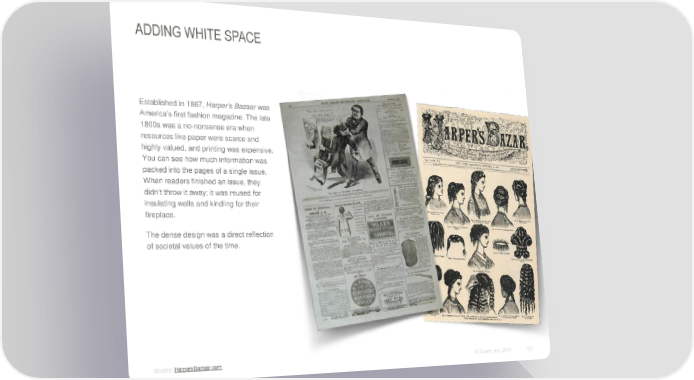 ADDING WHITE SPACE Established in 1867, Harper’s Bazaar was America’s first fashion magazine. The late 1800s was a no-nonsense era when resources like paper were scarce and highly valued, and printing was expensive. You can see how much information was packed into the pages of a single issue. When readers finished an issue, they didn’t throw it away; it was reused for insulating walls and kindling for their fireplace. The dense design was a direct reflection of societal values of the time. Source: HarpersBazaar.com © Duarte, Inc. 2014 122