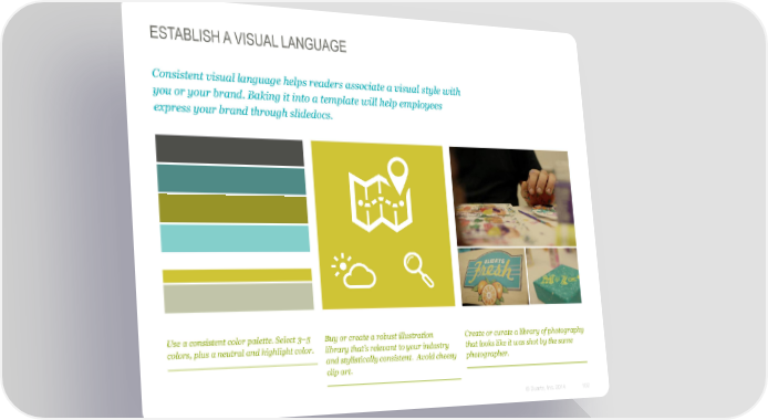 ESTABLISH A VISUAL LANGUAGE Consistent visual language helps readers associate a visual style with you or your brand. Baking it into a template will help employees express your brand through slidedocs. Use a consistent color palette. Select 3–5 Buy or create a robust illustration Create or curate a library of photography colors, plus a neutral and highlight color. library that’s relevant to your industry that looks like it was shot by the same and stylistically consistent. Avoid cheesy photographer. clip art. © Duarte, Inc. 2014 102