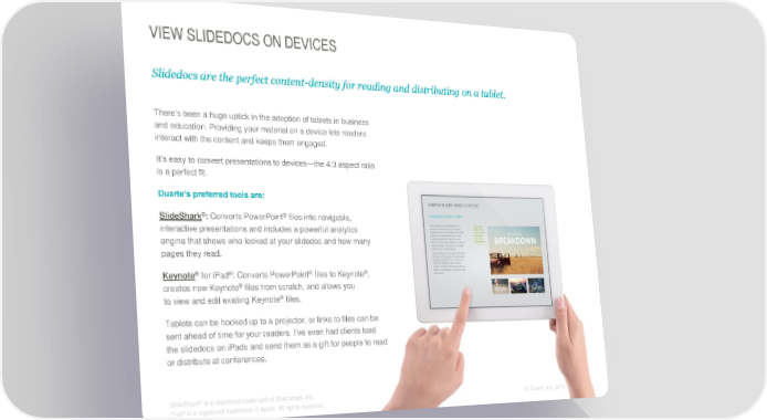 VIEW SLIDEDOCS ON DEVICES Slidedocs are the perfect content-density for reading and distributing on a tablet. There’s been a huge uptick in the adoption of tablets in business and education. Providing your material on a device lets readers interact with the content and keeps them engaged. It’s easy to convert presentations to devices—the 4:3 aspect ratio is a perfect fit. Duarte’s preferred tools are: SlideShark®: Converts PowerPoint® files into navigable, interactive presentations and includes a powerful analytics engine that shows who looked at your slidedoc and how many pages they read. ® ® ® ® Keynote for iPad : Converts PowerPoint files to Keynote , creates new Keynote® files from scratch, and allows you to view and edit existing Keynote® files. Tablets can be hooked up to a projector, or links to files can be sent ahead of time for your readers. I’ve even had clients load the slidedocs on iPads and send them as a gift for people to read or distribute at conferences. ® SlideShark is a registered trademark of Brainshark, Inc. ©© DDuuaarrttee,, IInncc.. 22001144 146 ® iPad is a registered trademark of Apple. All rights reserved.