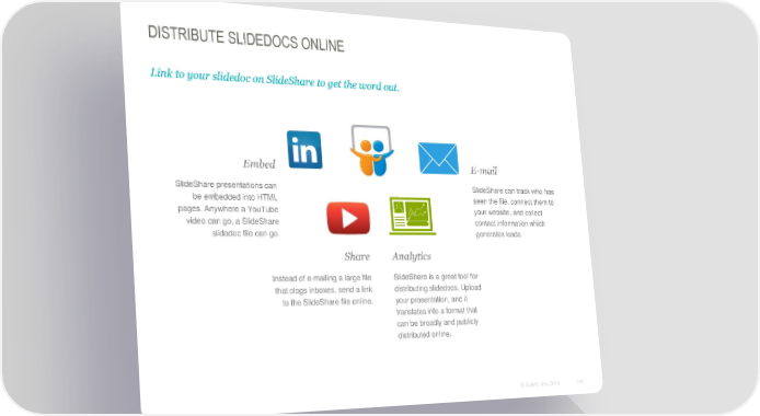 DISTRIBUTE SLIDEDOCS ONLINE Link to your slidedoc on SlideShare to get the word out. Embed E-mail SlideShare presentations can SlideShare can track who has be embedded into HTML seen the file, connect them to pages. Anywhere a YouTube your website, and collect video can go, a SlideShare contact information which slidedoc file can go. generates leads. Share Analytics Instead of e-mailing a large file SlideShare is a great tool for that clogs inboxes, send a link distributing slidedocs. Upload to the SlideShare file online. your presentation, and it translates into a format that can be broadly and publicly distributed online. © Duarte, Inc. 2014 144