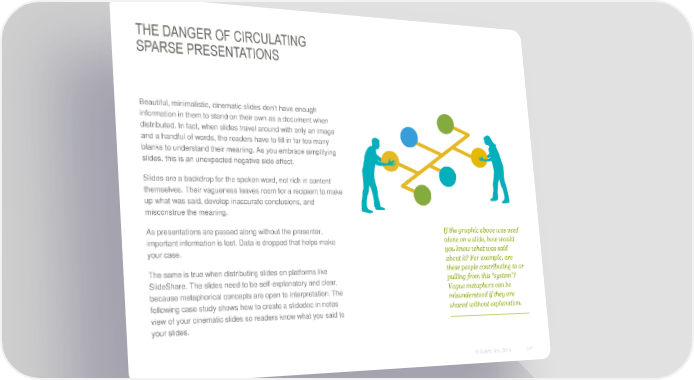 THE DANGER OF CIRCULATING SPARSE PRESENTATIONS Beautiful, minimalistic, cinematic slides don’t have enough information in them to stand on their own as a document when distributed. In fact, when slides travel around with only an image and a handful of words, the readers have to fill in far too many blanks to understand their meaning. As you embrace simplifying slides, this is an unexpected negative side effect. Slides are a backdrop for the spoken word, not rich in content themselves. Their vagueness leaves room for a recipient to make up what was said, develop inaccurate conclusions, and misconstrue the meaning. As presentations are passed along without the presenter, If the graphic above was used important information is lost. Data is dropped that helps make alone on a slide, how would your case. you know what was said about it? For example, are The same is true when distributing slides on platforms like these people contributing to or SlideShare. The slides need to be self-explanatory and clear, pulling from this “system”? because metaphorical concepts are open to interpretation. The Vague metaphors can be following case study shows how to create a slidedoc in notes misunderstood if they are view of your cinematic slides so readers know what you said to shared without explanation. your slides. © Duarte, Inc. 2014 147