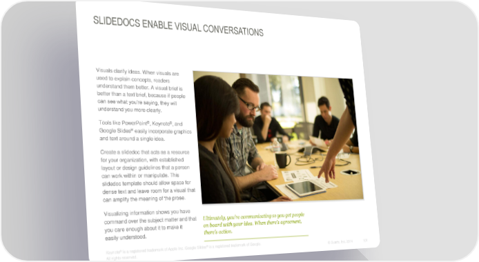 SLIDEDOCS ENABLE VISUAL CONVERSATIONS Visuals clarify ideas. When visuals are used to explain concepts, readers understand them better. A visual brief is better than a text brief, because if people can see what you’re saying, they will understand you more clearly. ® ® Tools like PowerPoint , Keynote , and Google Slides® easily incorporate graphics and text around a single idea. Create a slidedoc that acts as a resource for your organization, with established layout or design guidelines that a person can work within or manipulate. This slidedoc template should allow space for dense text and leave room for a visual that can amplify the meaning of the prose. Visualizing information shows you have command over the subject matter and that Ultimately, you’re communicating so you get people you care enough about it to make it on board with your idea. When there’s agreement, easily understood. there’s action. ® ® Keynote is a registered trademark of Apple Inc. Google Slides is a registered trademark of Google. © Duarte, Inc. 2014 101 All rights reserved.
